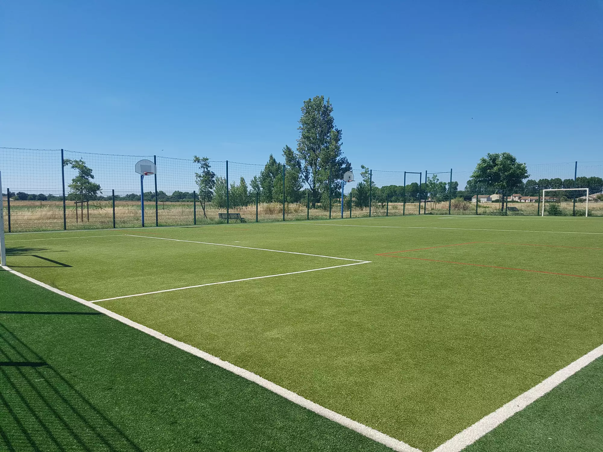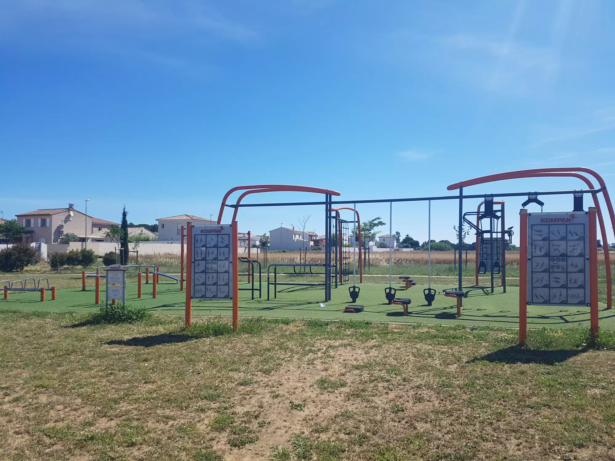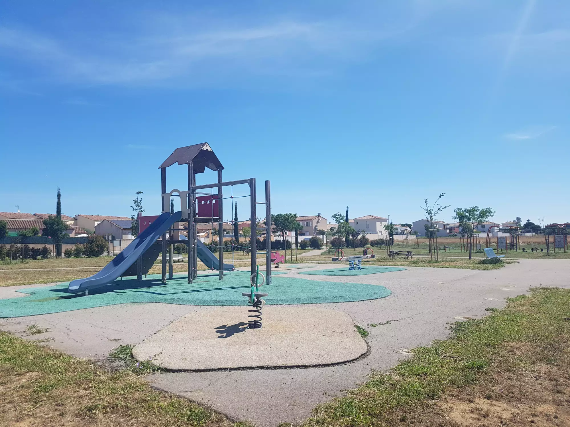 Très grands espaces, avec à la fois des jeux pour enfants, une espace foot/basket, un pump park, une table de ping-pong. Pour les adultes : un espace musculation. Les arbres sont encore trop jeunes pour faire de l'ombre, attention donc aux journées très ensoleillées.