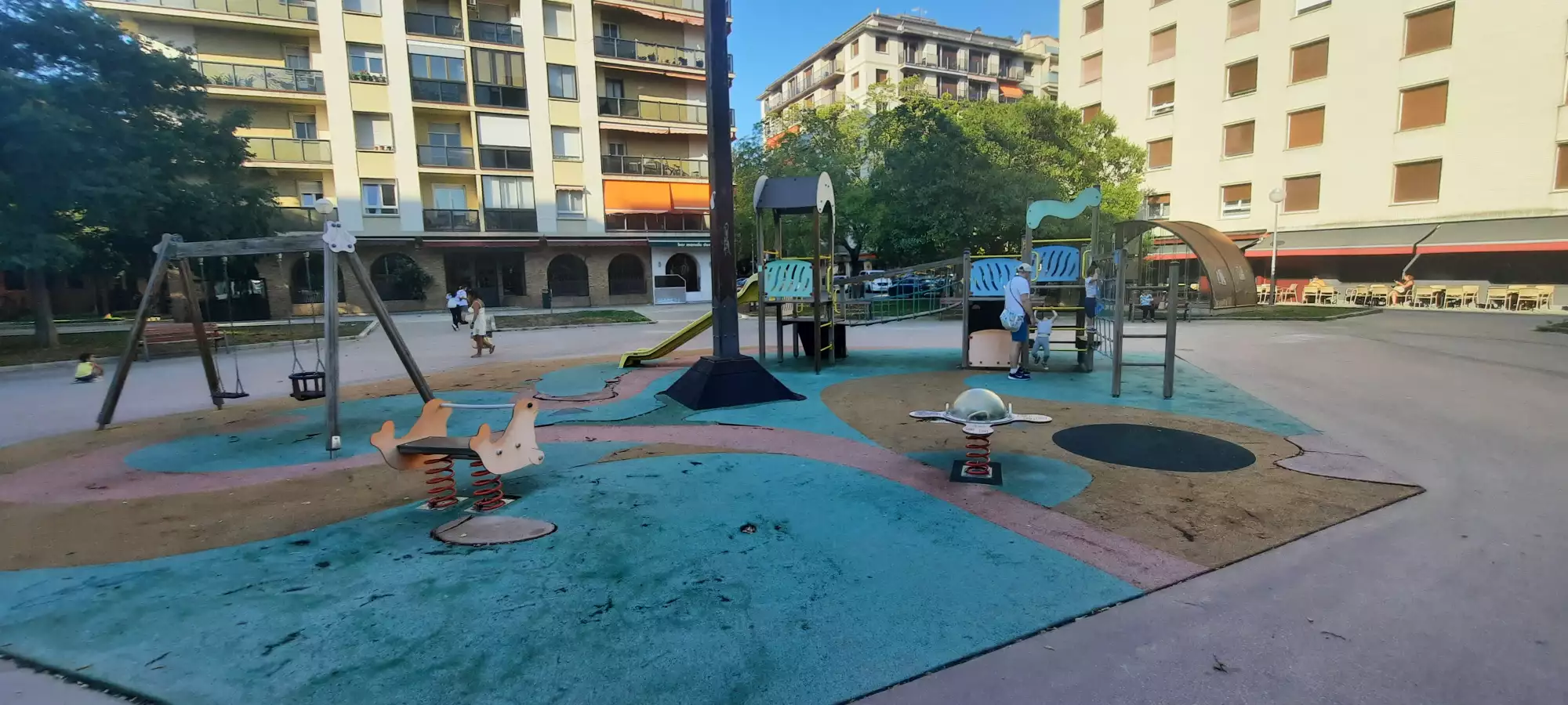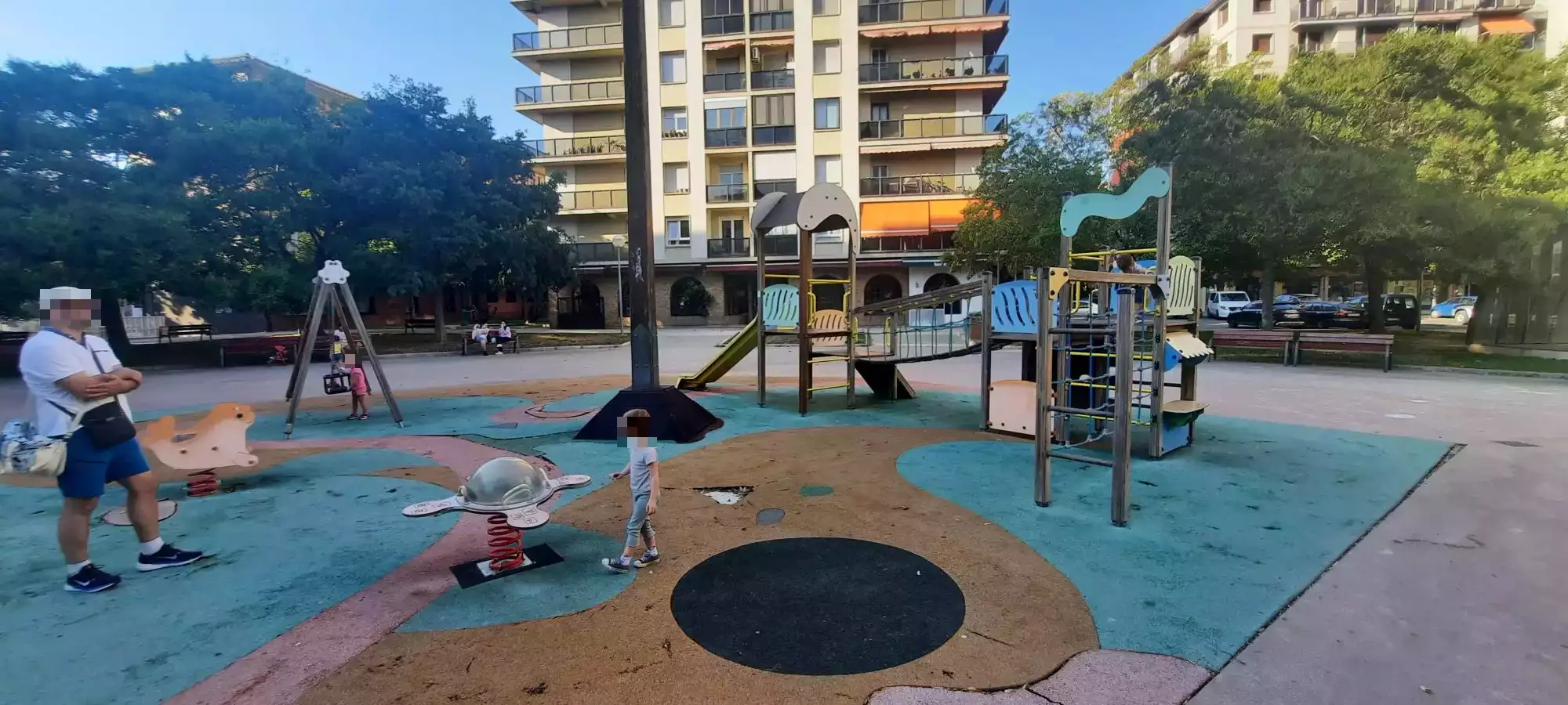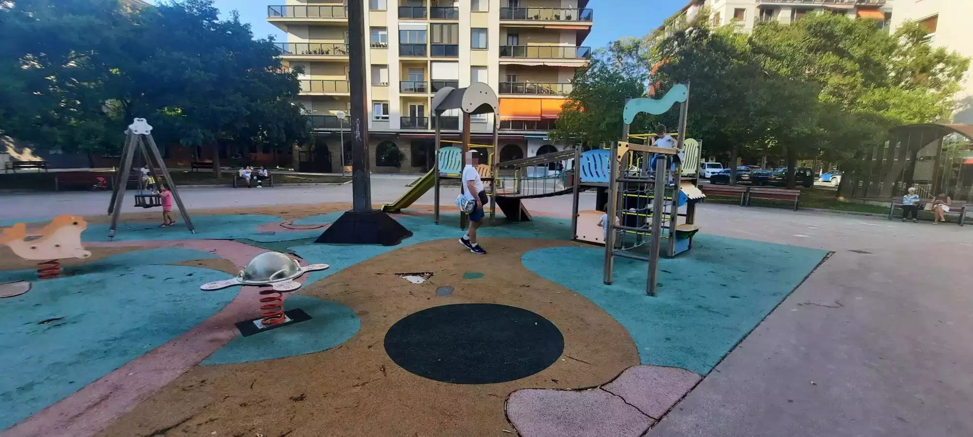 Ombragé, bancs et au centre des immeubles donc loin de la rue. Sol en mauvais état mais synthétique.