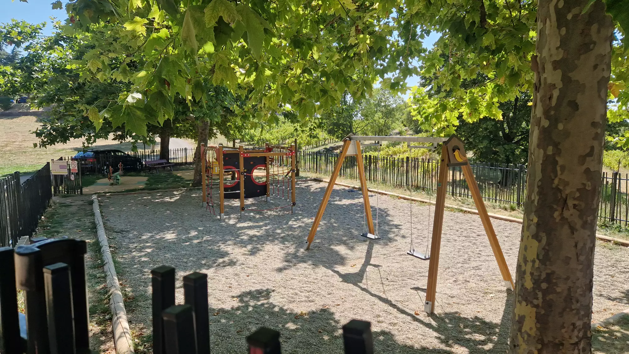 Parc de jeux ombragé et clôturé sur Aiguines, pour les petits comme les plus grands, les enfants s'y régalent.