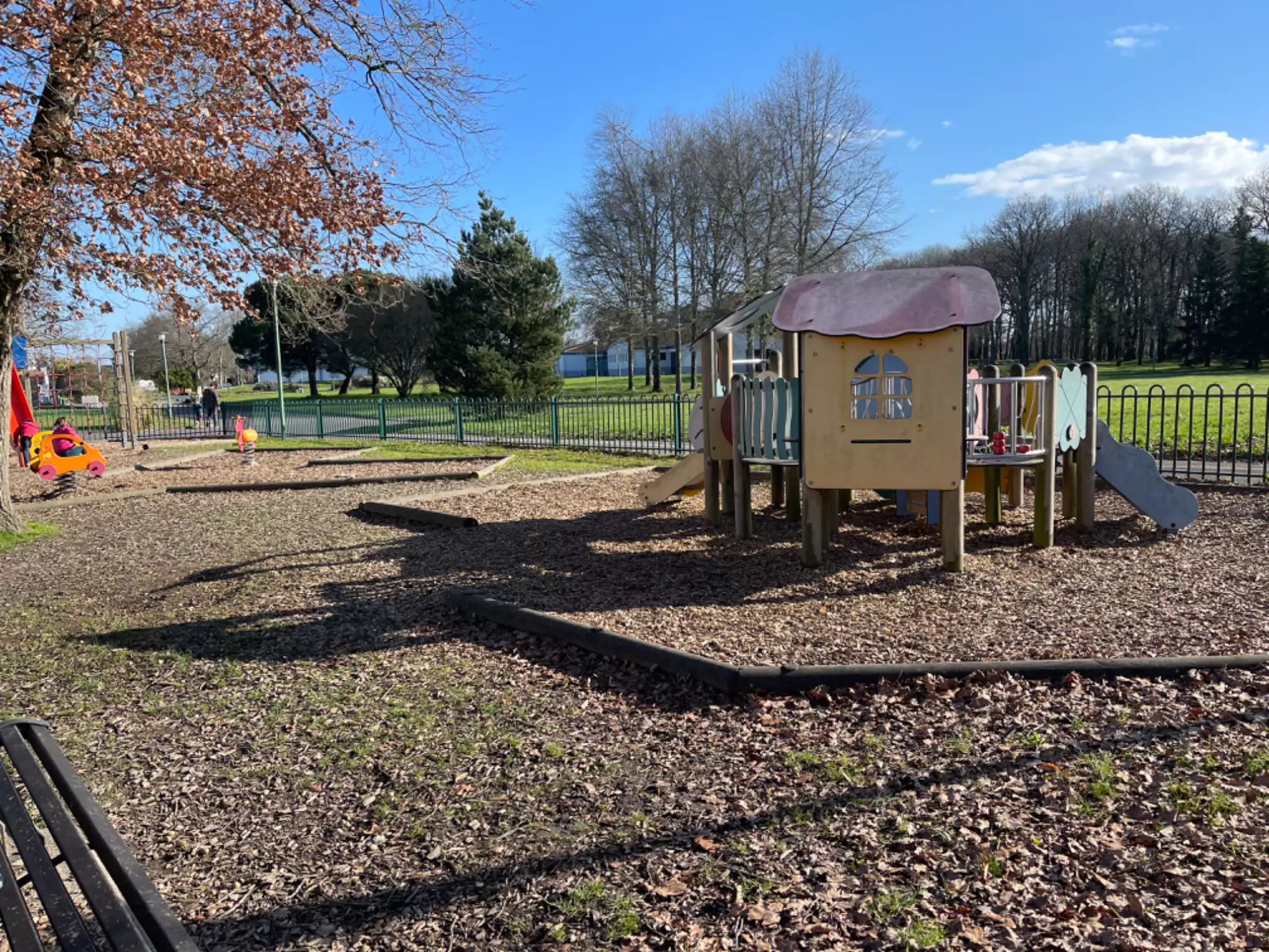 Aire de jeux de petite taille devant une grande zone de pelouse.