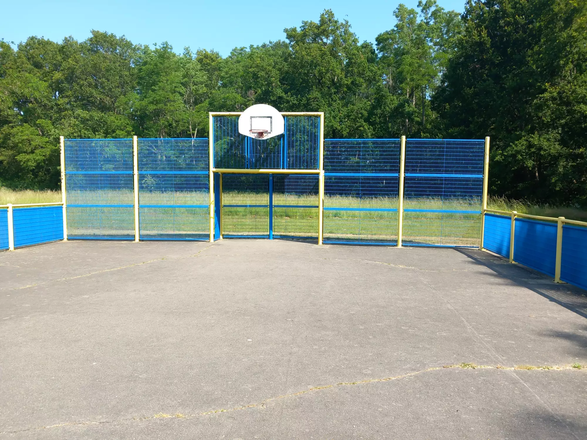 Un city stade avec but et panier de basket.