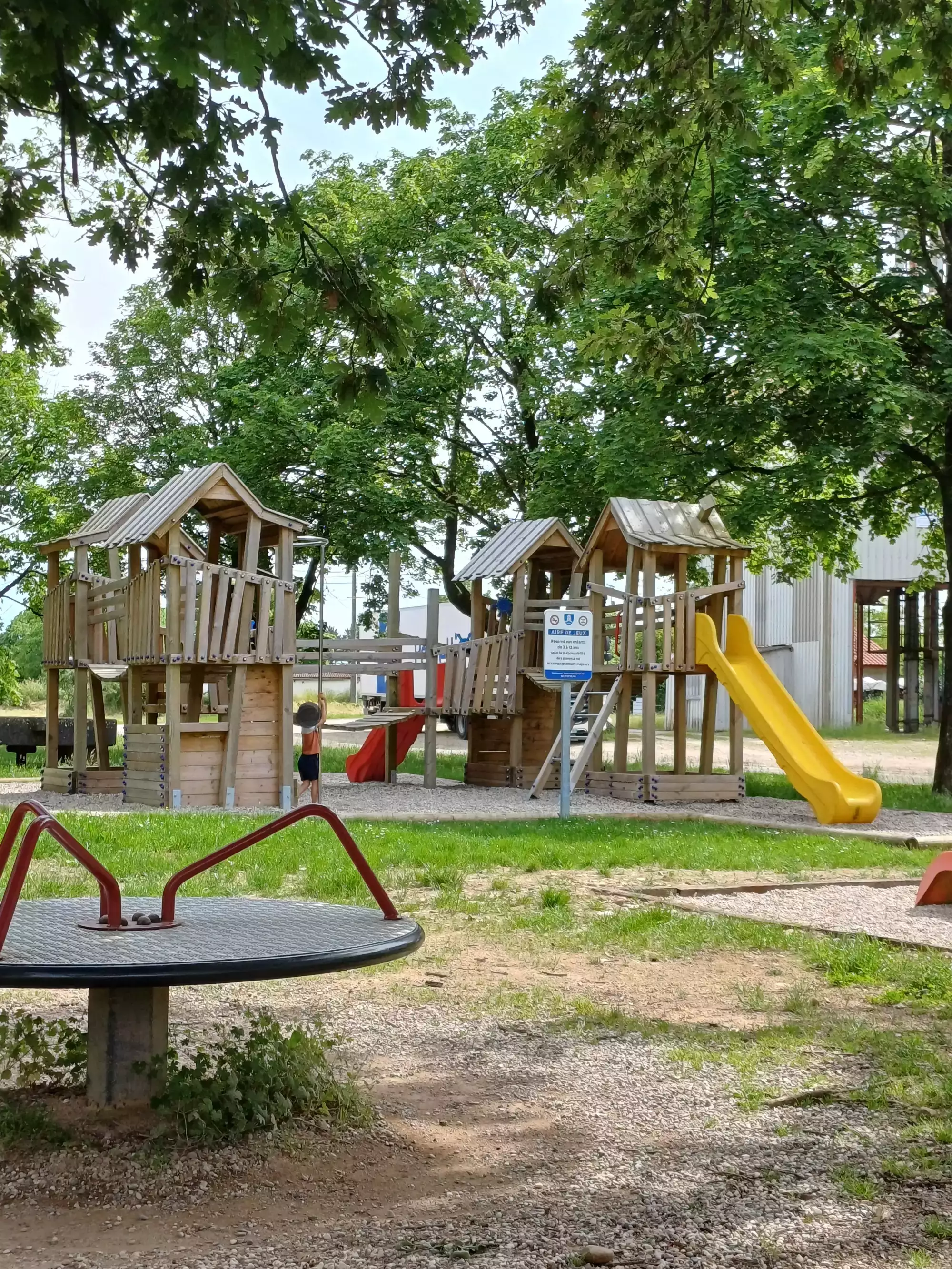 Air de jeux avec une belle structure en bois, toboggan et tourniquet. Des bancs à l'ombre.