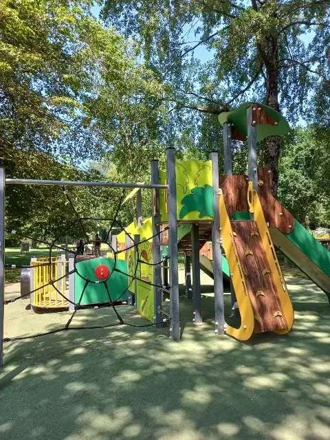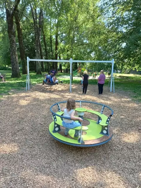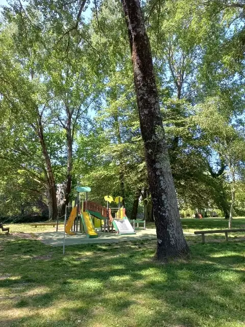 Etendue verte en cœur de ville et en bord de rivière comprenant une structure multi-jeux, des balançoires et un tourniquet accessibles aux enfants en situation de handicap, ainsi qu’une tyrolienne de 34 mètres à destination des 7-14 ans.