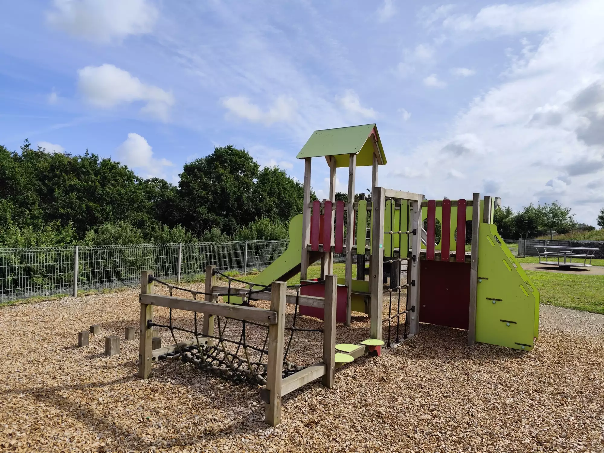 Situé derrière le bibliothèque, il y a même un chemin pour se promener et des tables de pic nique a l'extérieur de l'aire de jeux.