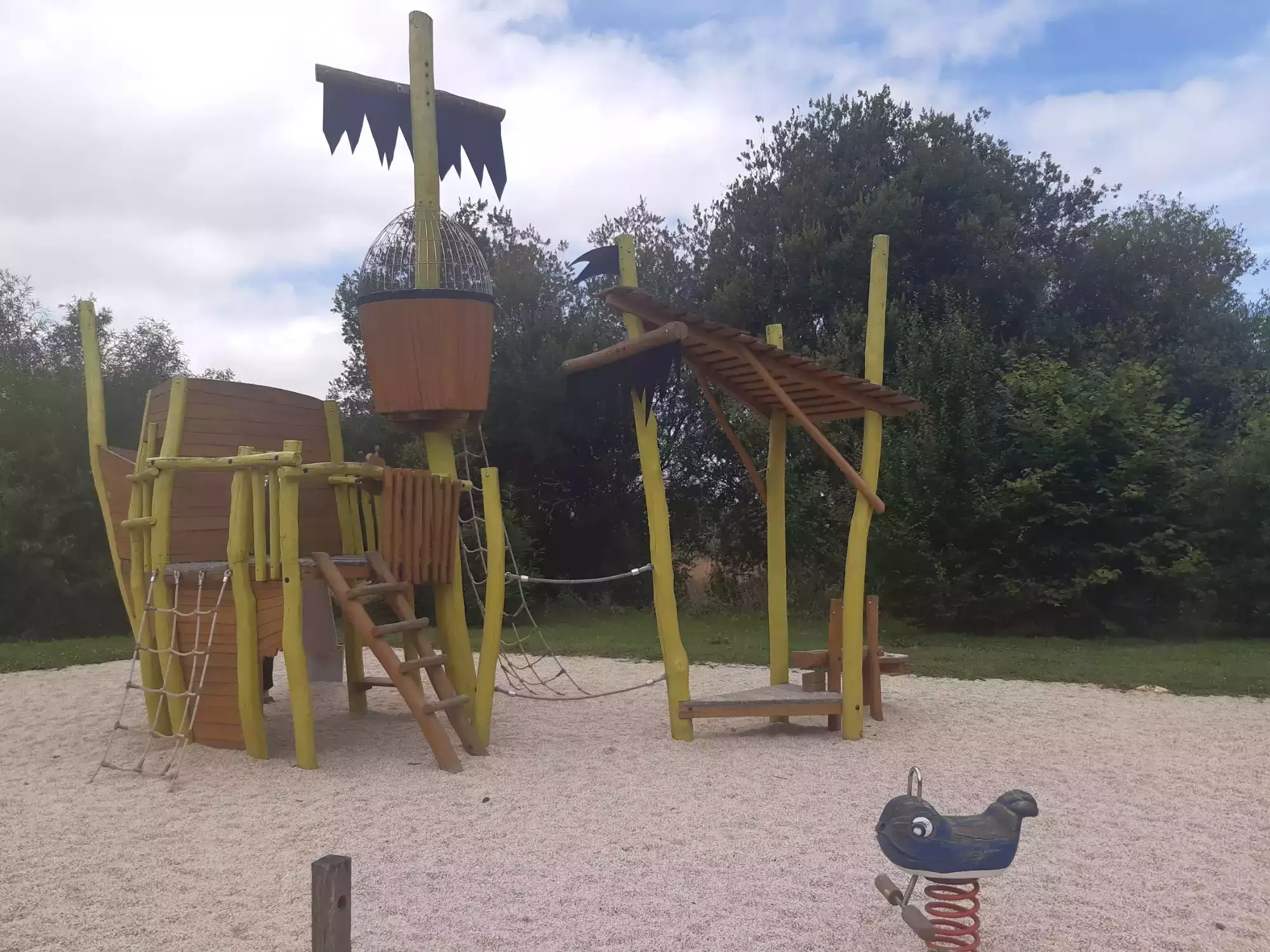 Structure inspirée d’un bateau pirate, une balançoire, un toboggan et deux jeux sur ressort