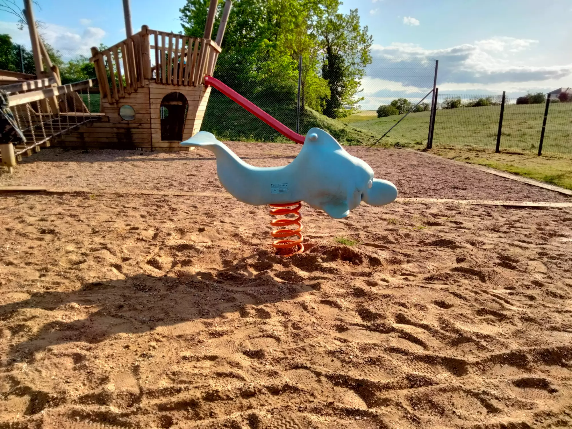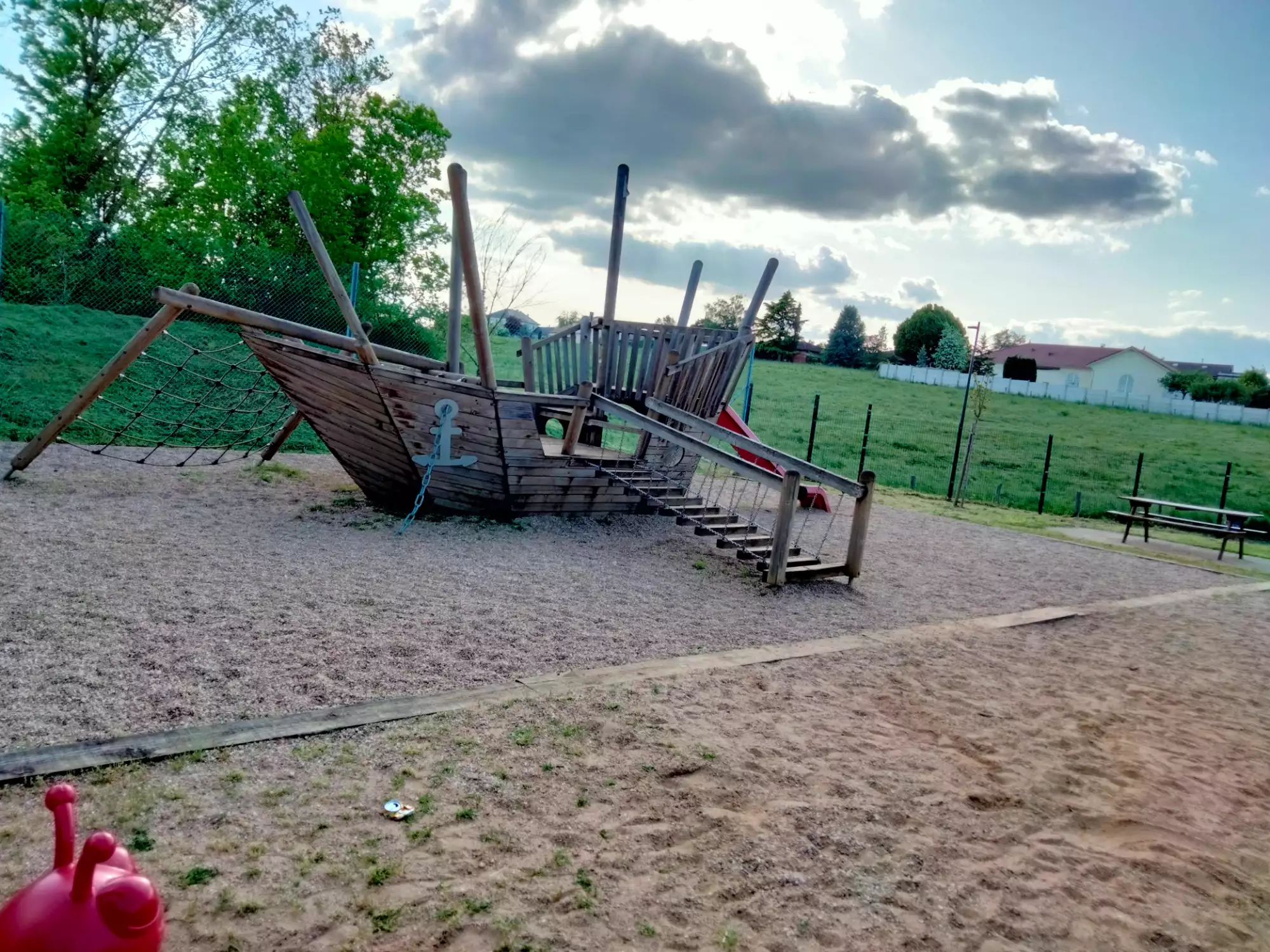 Un city stade en sable, un bateau pirate avec toboggan